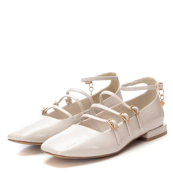 Ballerina da donna, marchio Xti. Realizzata in vernice. Modello multi-fascia con fibbie dorate. Tacco basso e suola in gomma antiscivolo. Potrai abbinarla sia in ufficio che per uscire elegantemente. Ideale per quest'estate. Questo modello è certificato vegano dall'organizzazione mondiale PETA (Animal Rights Organisation).